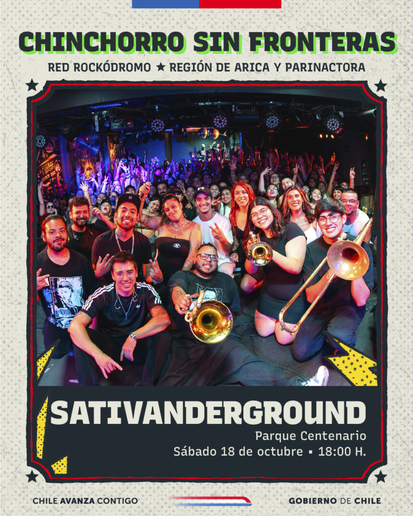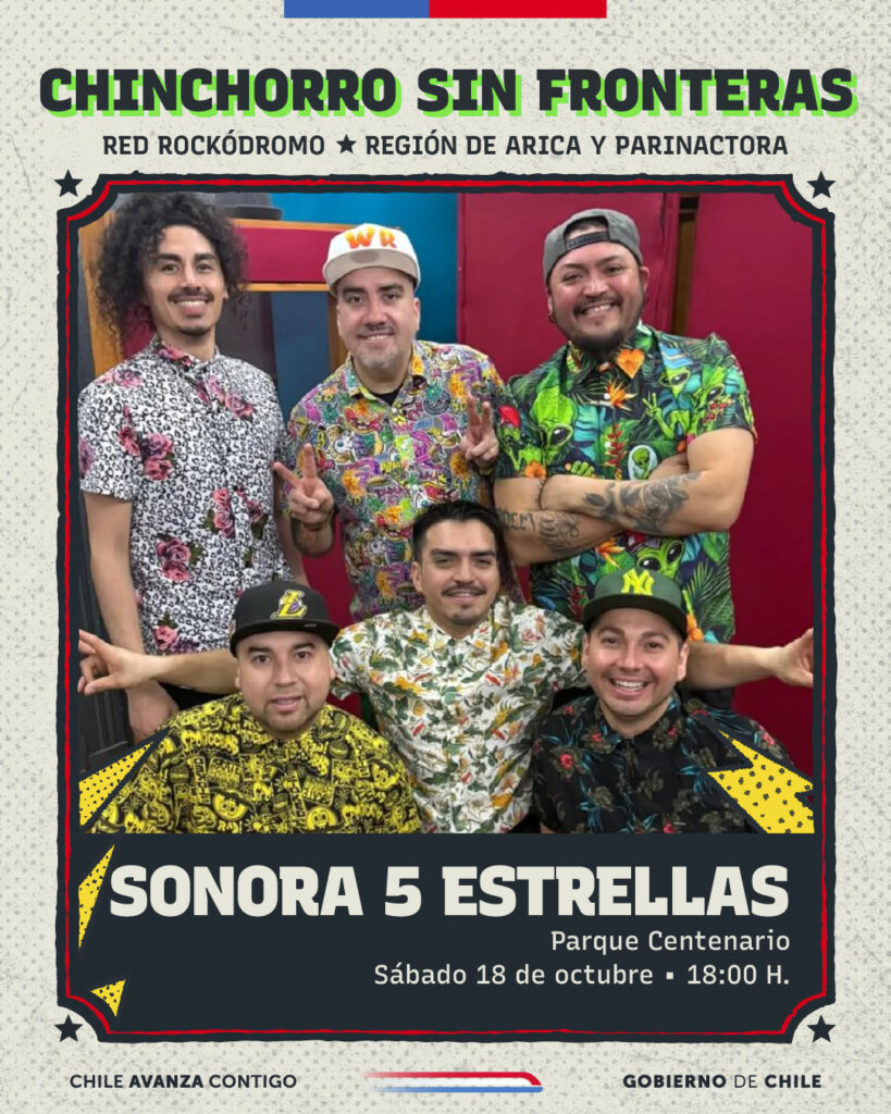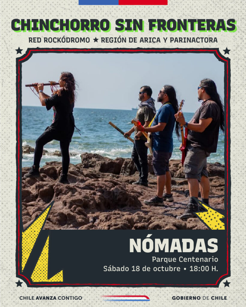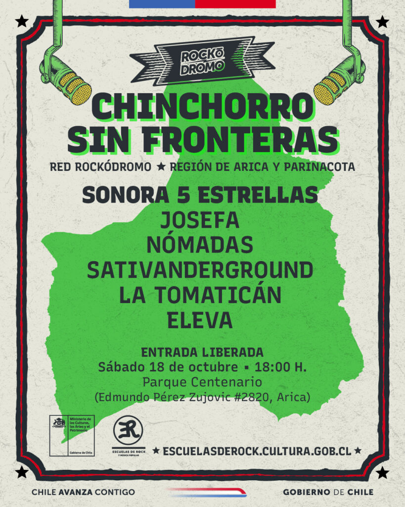 Chinchorro Sin Fronteras 2025 se realizará el sábado 18 de octubre en el Parque Centenario (Edmundo Pérez Zujovic #2820, Arica) desde las 18.00 horas. La entrada es liberada, por orden de llegada y hasta completar aforo. Junto a las cinco bandas seleccionadas –Nómadas, Josefa, Eleva, Sativanderground, La Tomaticán– la jornada contará con Sonora 5 Estrellas.