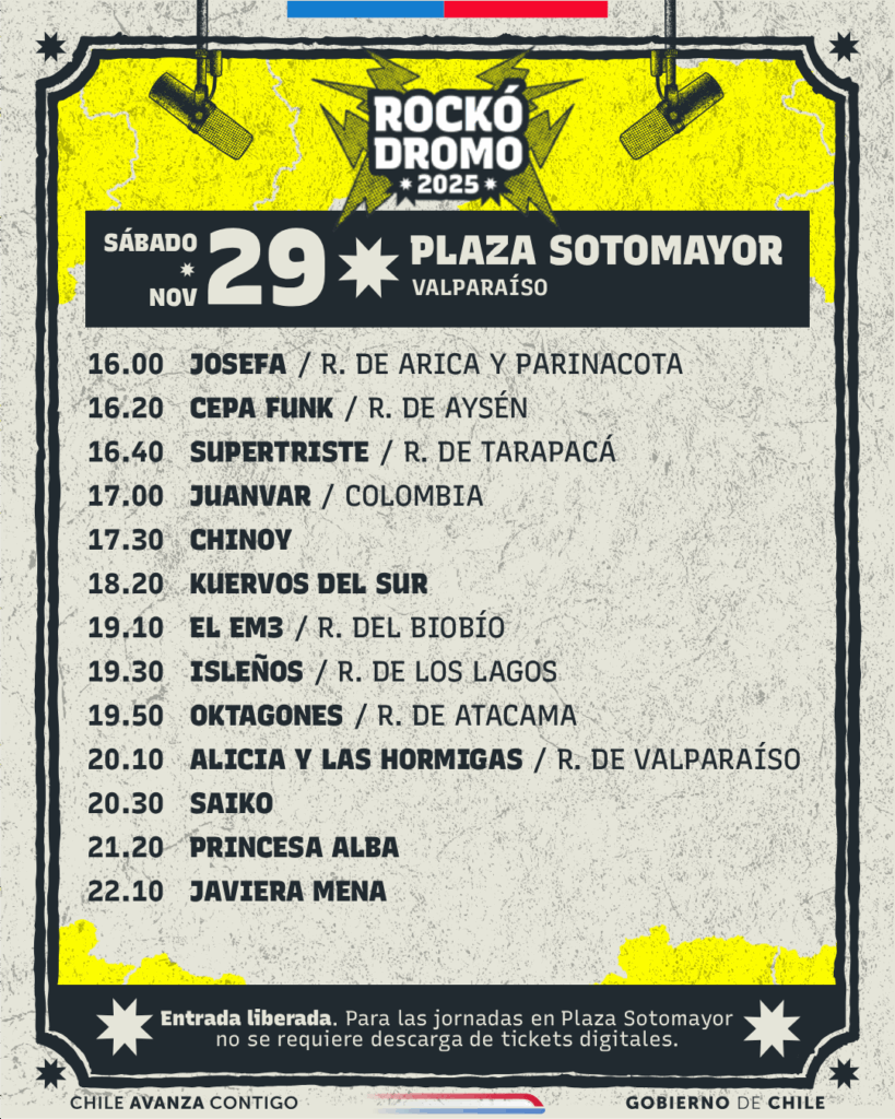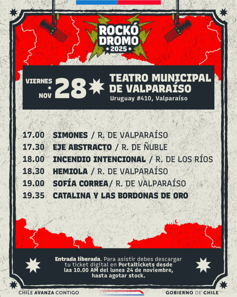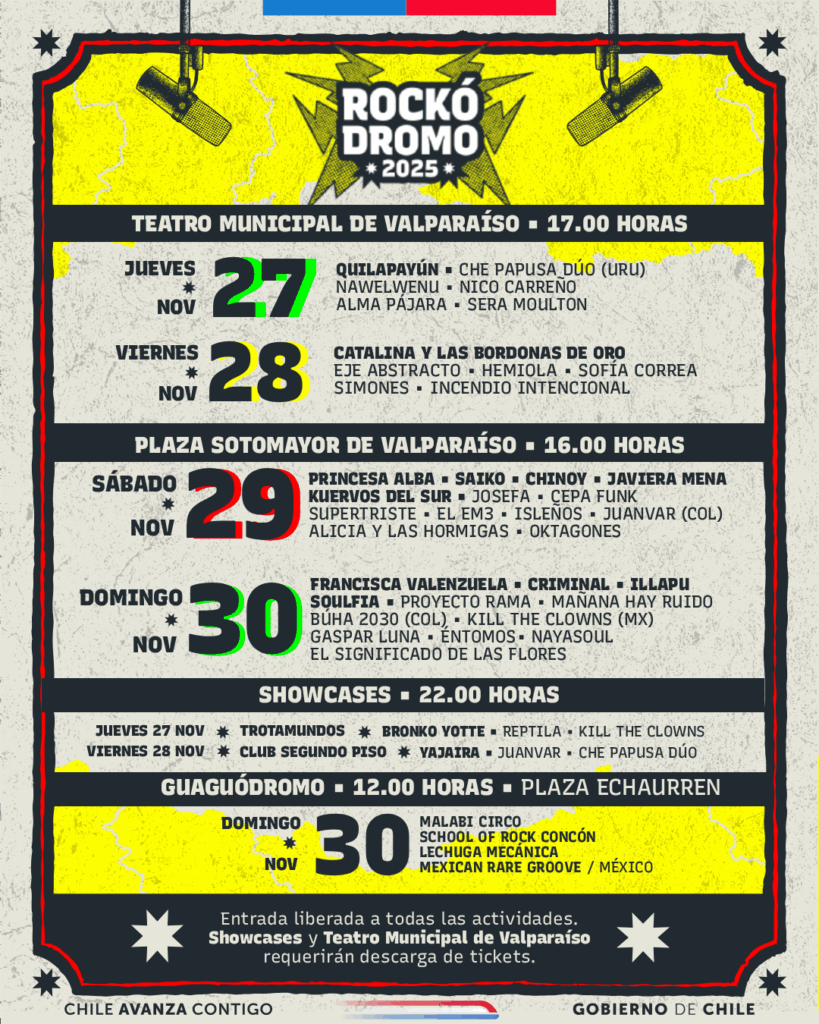 Una nueva versión del festival Rockódromo asoma hacia fines de noviembre, y con ello, cuatro días de fiesta musical, con bandas y artistas provenientes desde las 16 regiones de Chile, una avanzada de números internacionales y destacados invitados del medio local. Rockódromo 2025 se realizará en Valparaíso, Chile, desde el 27 al 30 de noviembre, con entrada liberada a todas las actividades. Organiza el Ministerio de las Culturas, las Artes y el Patrimonio a través del programa Escuelas de Rock y Música Popular.
