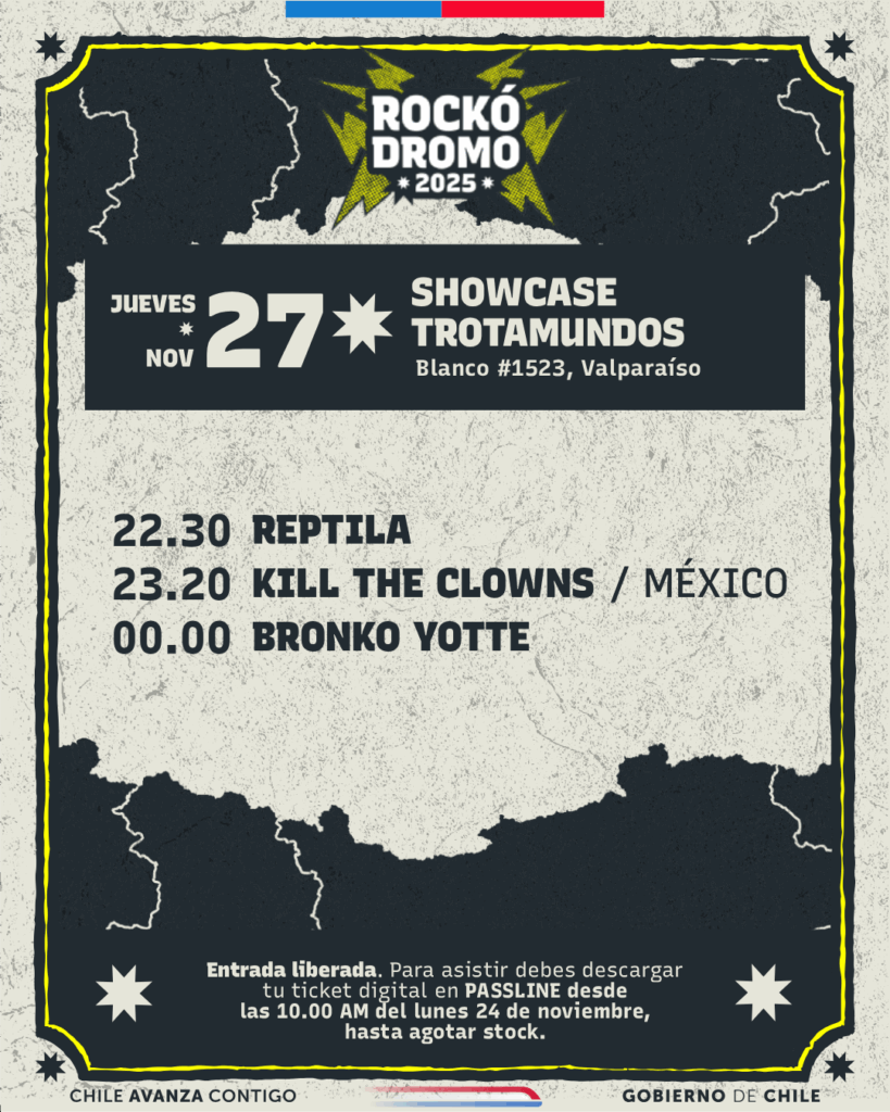 📍Trotamundos Valparaíso (Blanco 1253): Jueves 27 de noviembre. Puertas desde las 21.30 horas y música desde las 22.30 horas. Se presentarán: BRONKO YOTTE • KILL THE CLOWNS (MX) • REPTILA. Consigue tus entradas en PASSLINE desde las 10.00 horas del 29/10, haciendo clic aquí.