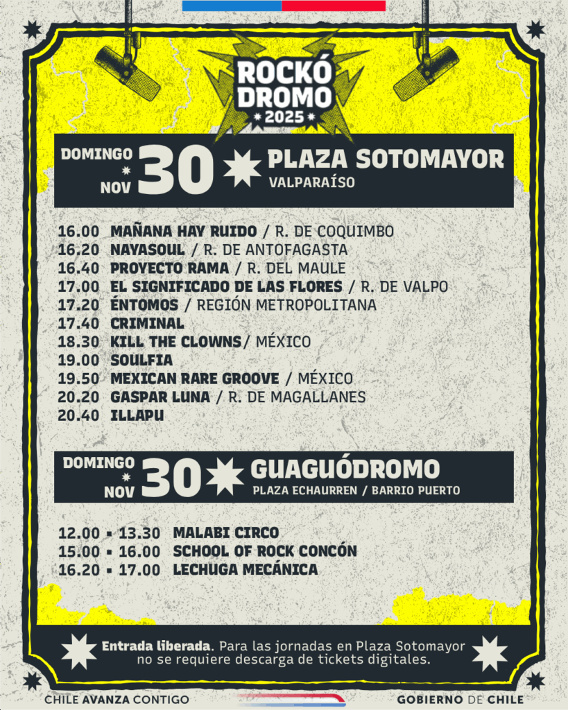 Domingo 30: CRIMINAL • ILLAPU • SOULFIA • PROYECTO RAMA • MAÑANA HAY RUIDO • BÚHA 2030 (COL) • KILL THE CLOWNS (MX) • GASPAR LUNA • EL SIGNIFICADO DE LAS FLORES • NAYASOULÉNTOMOS