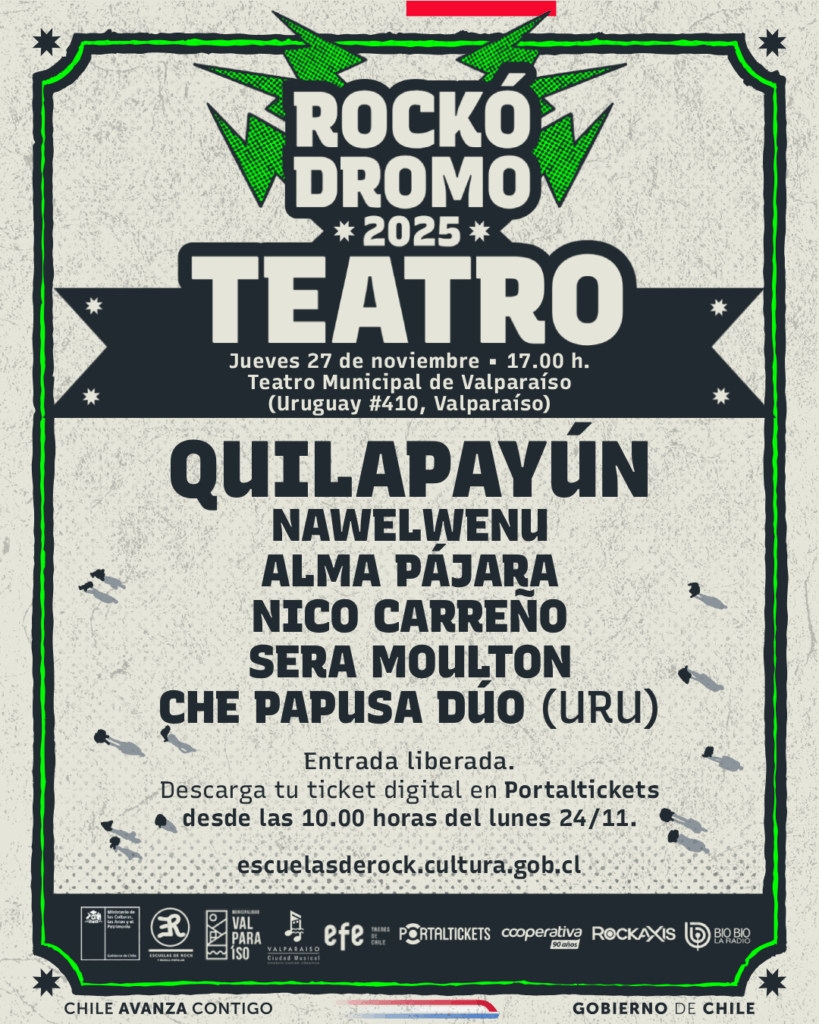 El festival Rockódromo 2025 celebrará su edición número 21 entre el jueves 27 y el domingo 30 de noviembre, desplegando su programación en varias locaciones de Valparaíso. La primera de esas jornadas musicales del festival porteño se vivirá desde el Teatro Municipal de Valparaíso (Uruguay #410) desde las 17.00 horas.