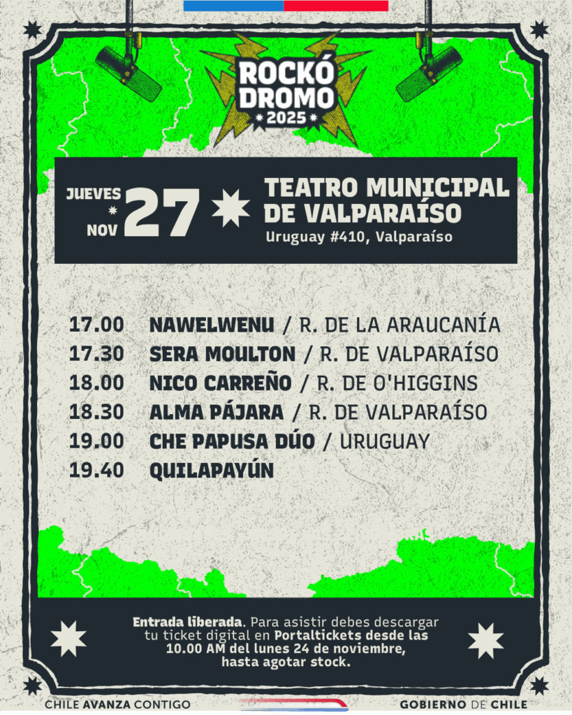 A continuación, conoce los horarios para el jueves 27 de noviembre en el Teatro Municipal de Valparaíso. Las actividades del festival se extenderán hasta el 30 de noviembre, y toda la información está disponible en esta página, así como en el IG de Rockódromo.