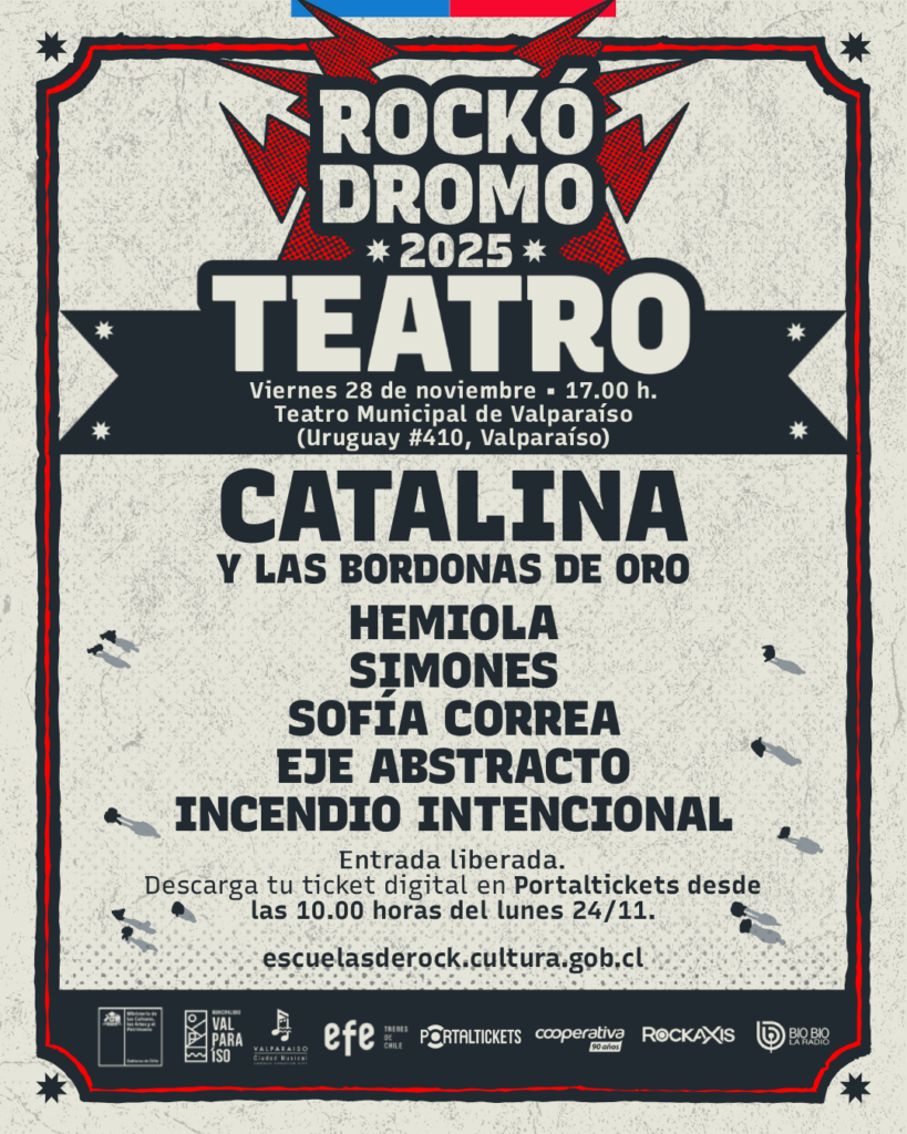 A continuación, conoce los horarios para el viernes 28 de noviembre en el Teatro Municipal de Valparaíso. Las actividades del festival se extenderán hasta el 30 de noviembre, y toda la información está disponible en esta página, así como en el IG de Rockódromo.