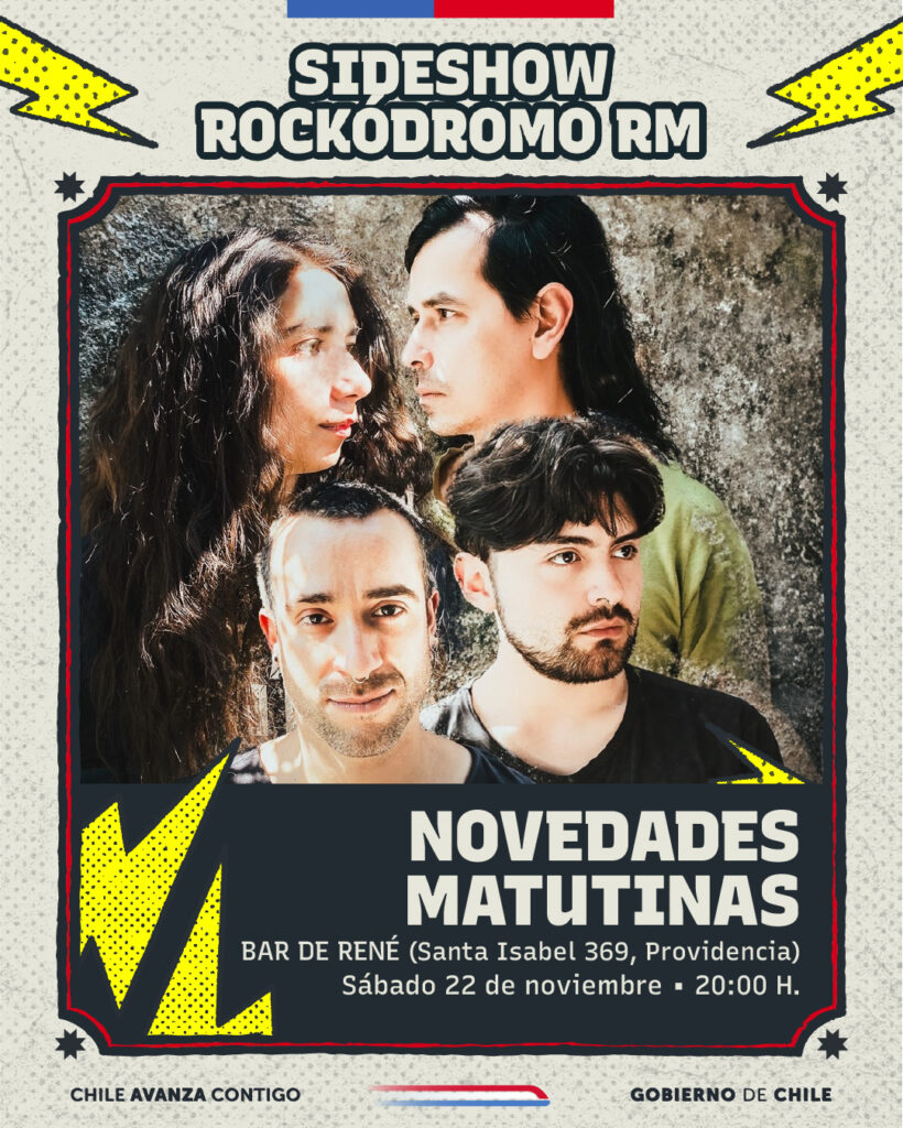 Novedades Matutinas (NNMM) es un cuarteto de música contemporánea fluctuante. A veces revienta un rock pesado, otras veces un indie experimental, y la mayoría de las veces nada termina como empieza. En 2017 editaron su primer disco, ‘Octopolar’, lanzado en Sala Máster, y el mismo año se presentaron en diversos escenarios de Santiago, Rancagua y Valparaíso. Tras publicar dos videoclips, se adjudican un Fondart para producir la edición física del mismo disco, relanzado en 2018 en Sala Máster. En 2022 editaron su segundo disco, ‘Monte Oculto’, presentado en el GAM, Valparaíso y Concepción, el mismo año. Este segundo disco también se adjudicó financiamiento Fondart para la producción y postproducción. Su líder, compositora, letrista, cantante y guitarrista Nicole Needham, acuñó el término popgresivo para hablar de esta música que mezcla el rock progresivo con el formato de canción popular. Hoy se encuentran terminando de componer su tercer disco de estudio, mientras continúan el largo peregrinaje de producir shows en vivo de alta calidad, que remuevan los conceptos preestablecidos de la música compuesta por mujeres, destacándose por una fuerza brutal en el discurso y en el poder de la música rock actual.
