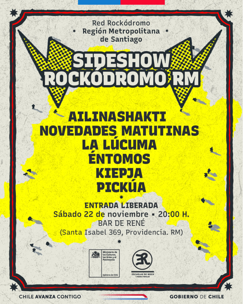 El Sideshow Rockódromo RM se realizará el sábado 22 de noviembre en el Bar de René (Santa Isabel #369, Providencia) desde las 20.00 horas. La entrada es liberada, por orden de llegada y hasta completar aforo (no requiere descarga de tickets).
